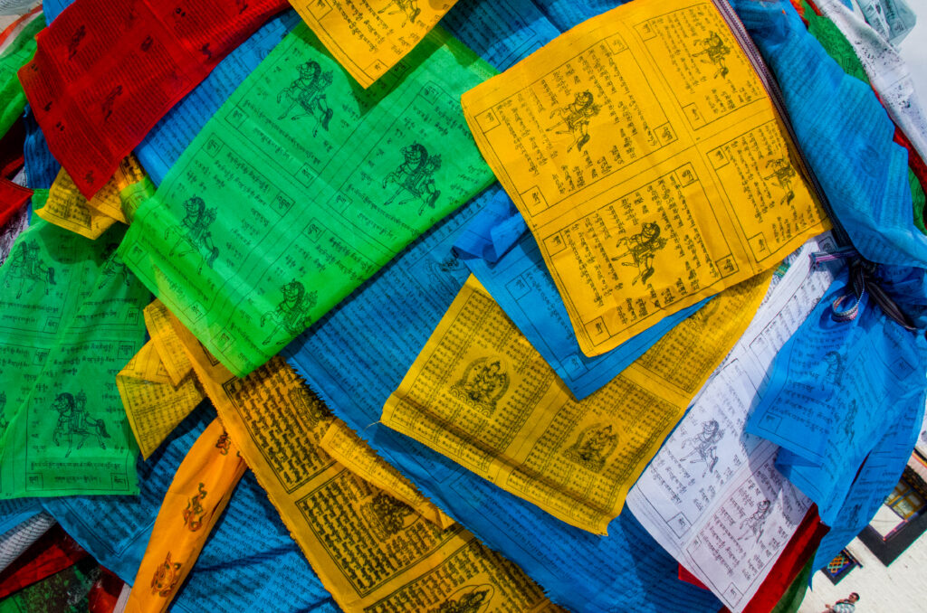 Die feinen Aufdrucke auf dem Stoff sind das Herzstück der Fahnen. Meist finden sich dort heilige Mantras wie „Om Mani Padme Hum“ sowie Symbole von Glücksbringern und Schutzgottheiten. In der Mitte ist oft das Windpferd abgebildet, das drei Juwelen auf seinem Rücken trägt. Diese Juwelen stehen für Buddha, die Lehre und die Gemeinschaft. Es geht bei diesen Texten nicht darum, dass sie von Menschen gelesen werden. Vielmehr fungieren die Symbole als spirituelle Siegel, deren Kraft durch die reine Präsenz am Ort wirkt und die Landschaft heiligt.