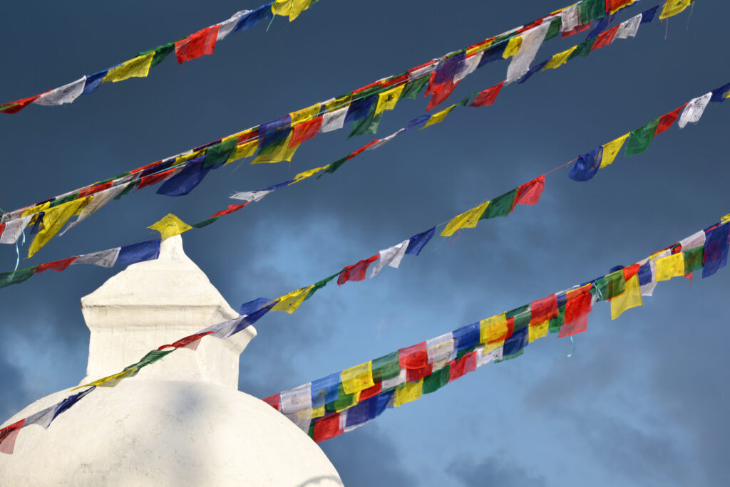 Bunte Gebetsfahnen flattern im Wind der nepalesischen Berge, um Segenswünsche und Gebete für Frieden und Mitgefühl in alle Himmelsrichtungen zu tragen.